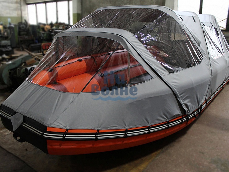 Боковины тента оснащены капитанскими окнами и могут быть полностью подняты, что создает открытое пространство вокруг лодки и обеспечивает легкий доступ к бортовой части. Это особенно удобно при стоянии на причале или для загрузки и разгрузки оборудования.